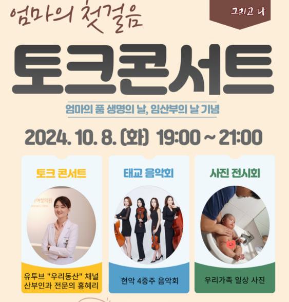 토크콘서트는 오후 7시부터 신청자들에게 사전에 받은 질문과 현장 질문을 바탕으로 임신과 출산에 관한 이야기를 나누는 형식으로 진행될 예정이며, △가족의 탄생을 위한 ‘미니 블록 쌓기’ △‘우리 가족을 소개합니다’ 가족사진 영상 상영 △정신건강의 날‧임산부의 날 맞이 ‘임산부 우울 검사’ 등 다양한 프로그램이 마련돼 있다.