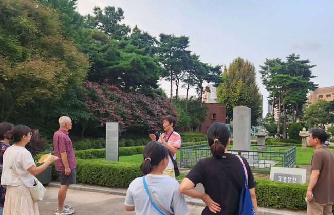 시민들이 장충단비 앞에서 문화해설사에게 설명을 듣고 있다.