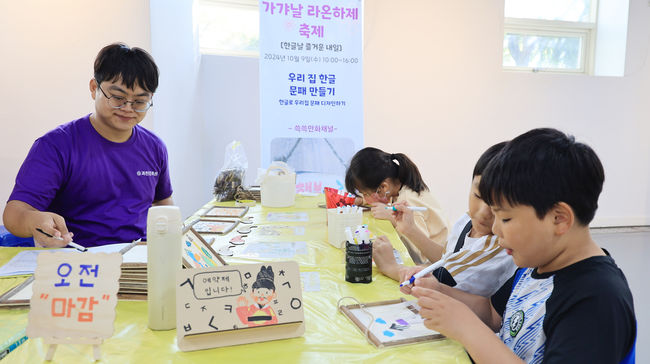 과천시 가갸날 라온하제 축제에서 아이들이 우리 집 한글 문패 만들기를 체험을 하고 있다