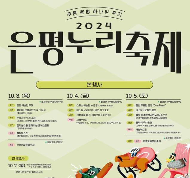 내달 5일에는 꿈의 무용단 은평 “One Point”, 버스킹X오후의 감탄, 폐막 기념 합창 공연, 폐막식 축하공연이 펼쳐진다. 합창 공연에는 가수 조관우가, 축하공연에는 가수 김태우, 박현빈, 정동하, 벤, 이에이트(EEIGHT)가 함께한다.